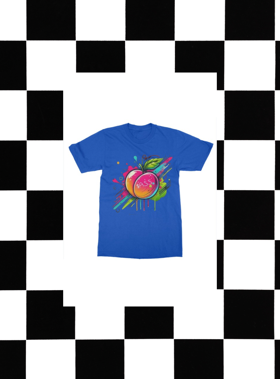 Make a bold statement with our most artistic $ASS design yet! This eye-catching piece features a stunning graffiti-style peach exploding with color on a vibrant royal blue backdrop. It's where street art meets crypto culture!