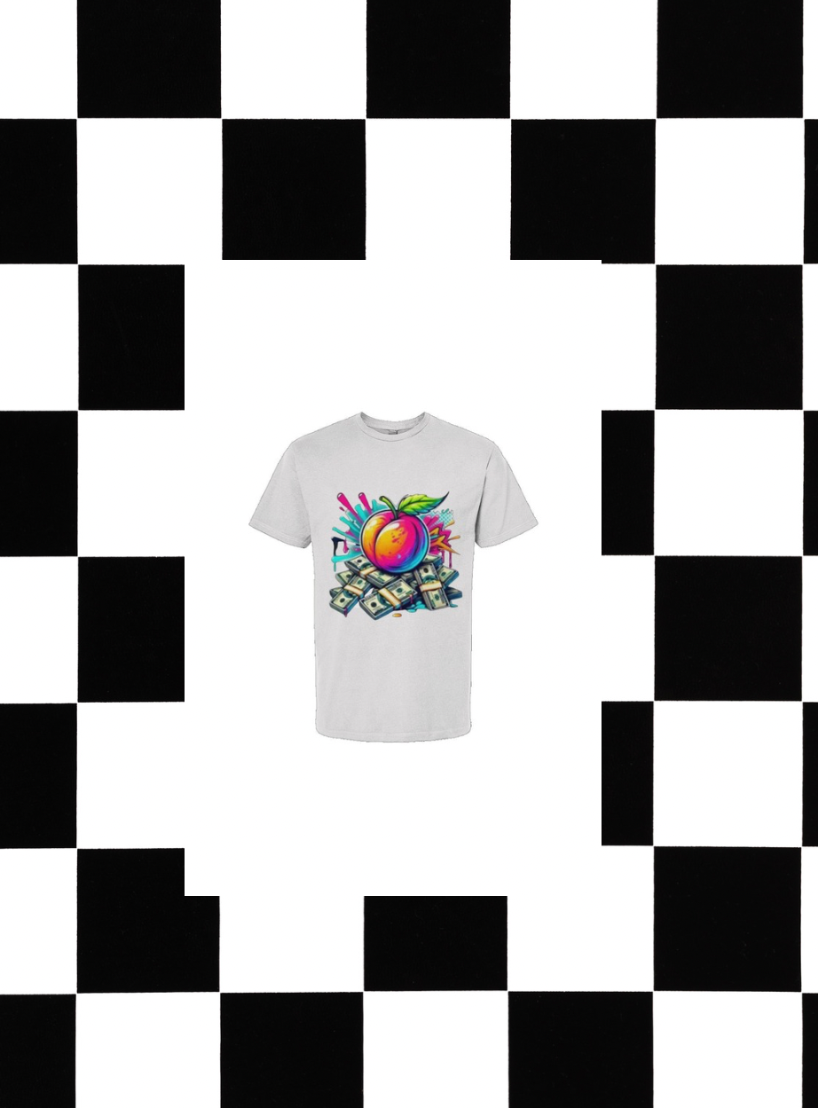 Make it rain with this exclusive $ASS holder streetwear! Our signature tee features a vibrant graffiti-style design with a colorful peach floating above stacks of cash - because that's how we roll in the $ASS community!